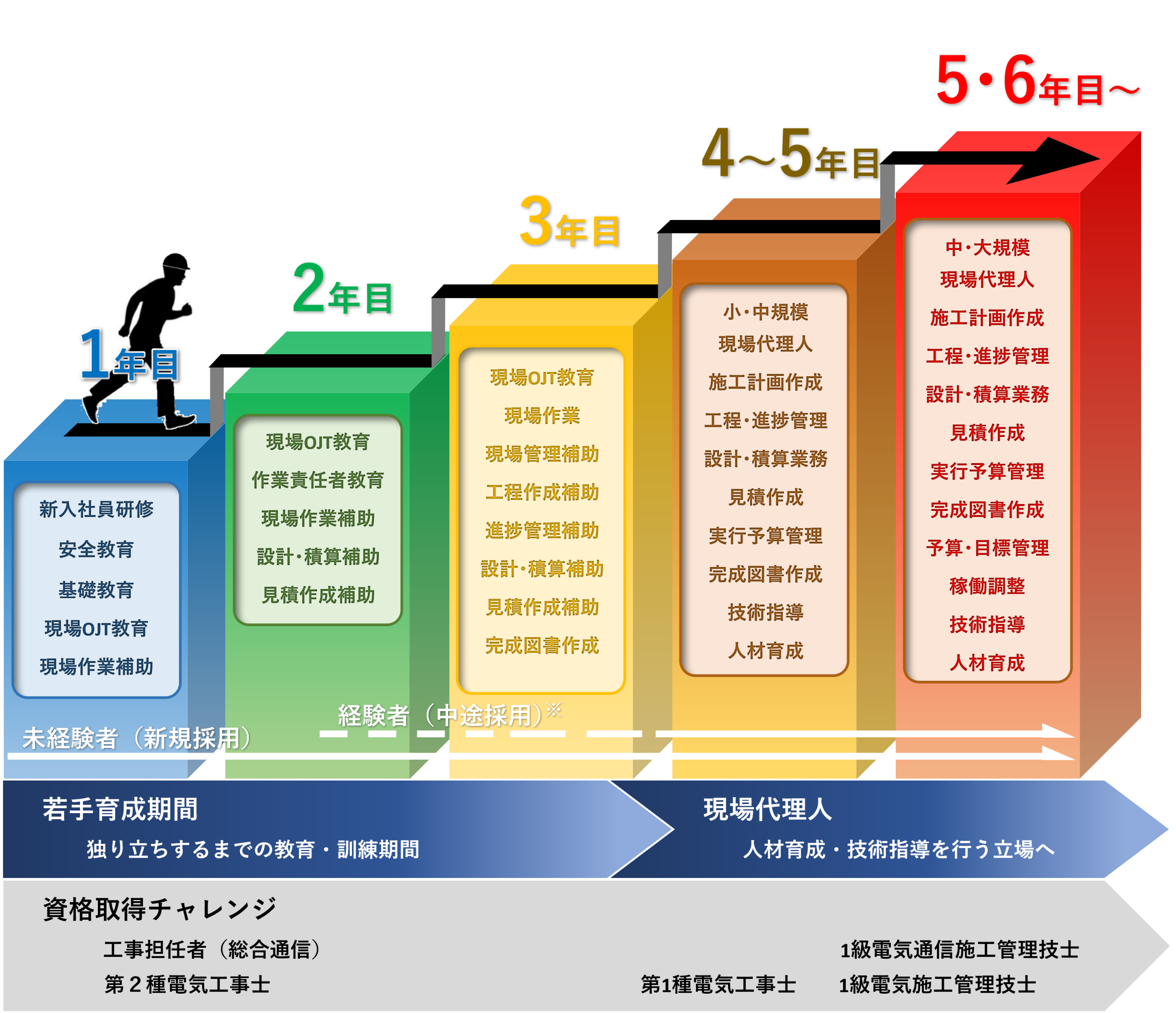 ※経験者(中途採用)では、電気通信工事や電気工事の実務経験があり、専門的なスキルやノウハウを持っており、即戦力としてご活躍して頂ける人材が対象です。
